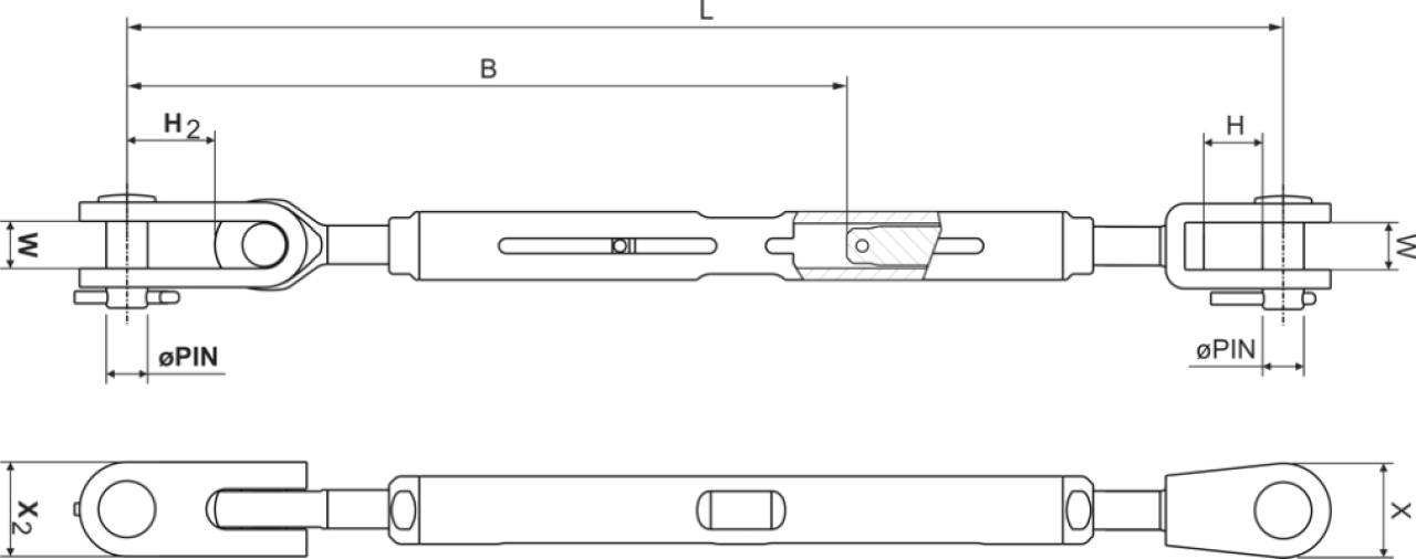 Item NoThread sizeClevis pin Ø (mm)LMIN (mm)LMAX (mm)W (mm)H (mm)X (mm)W2 (mm)H2 (mm)X2 (mm)